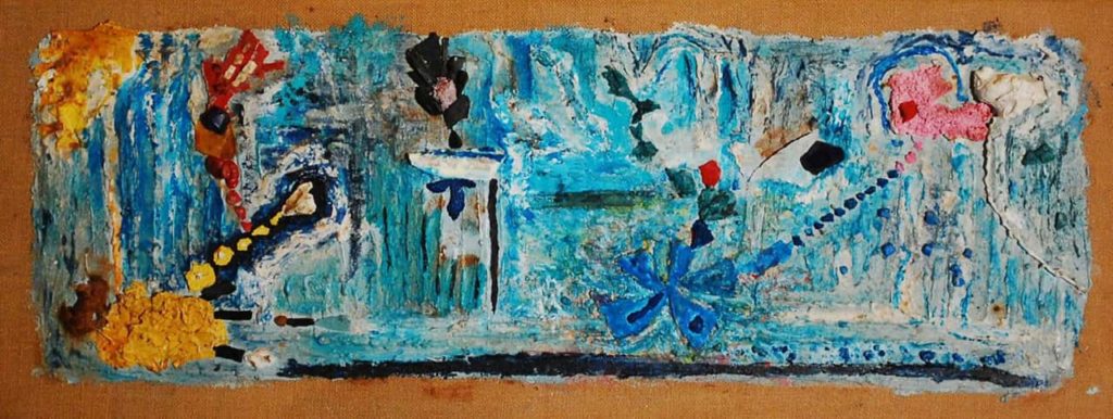 Tecnica mista, su tavola telata spessorata ,colori ad olio, acrilici ossidi terre, stucco colla materie plastiche modellate dal mare vetro carbone piante marine- 90×34